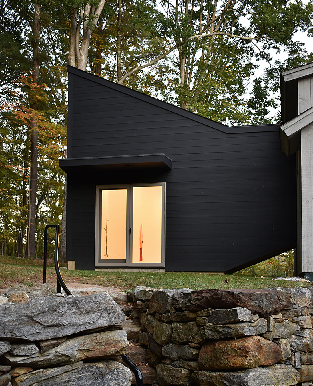 The ship-lap pine sheathing, stained ‘twilight zone’, recedes in shadow and reflects the seasonally changing wooded site.